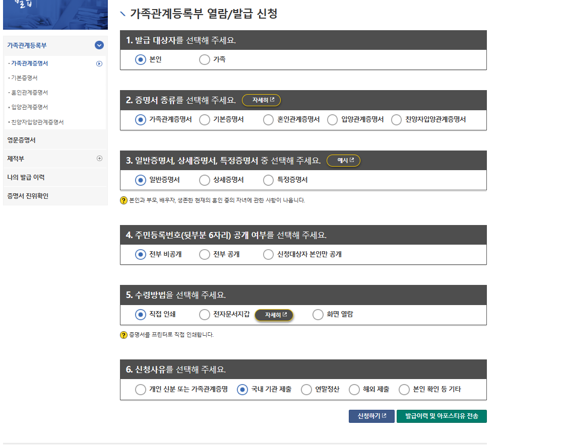 ※ 증명서의 종류도 선택 가능한데요. 가족관계증명서 부터 기본증명서, 혼인관계증명서, 입양관계증명서, 친양자입양관계증명서를 발급 가능 합니다.