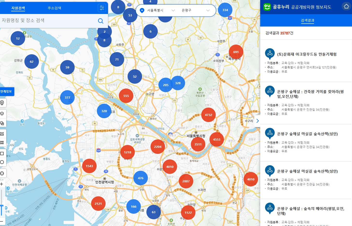 통합검색: 지역 선택 및 검색어 입력 또는 지도검색을 통해 빠르게 공공개방자원을 찾을 수 있습니다.