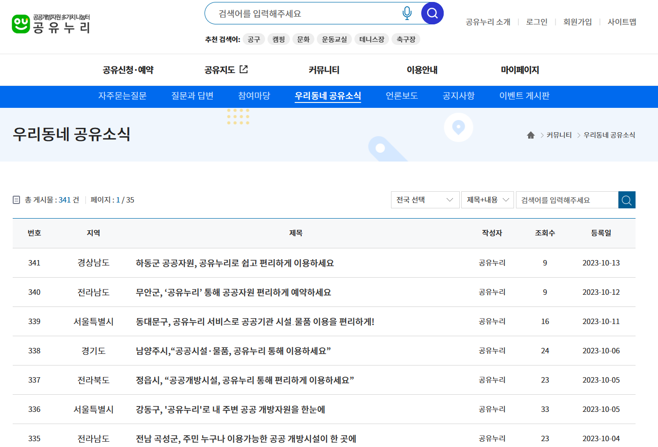커뮤니티: 공지사항, 이벤트, 지역 공유소식, Q&A, FAQ 등의 정보를 확인할 수 있습니다.
