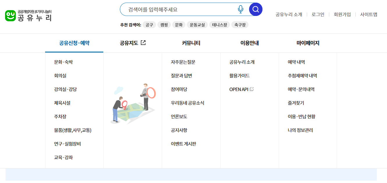 중앙행정기관과 지방자치단체, 공공기관 등 공공부문에서 국민에게 개방하는 시설, 물품 등 공공개방자원을 국민이 온라인에서 검색하고 예약하는 대국민 공공개방자원 공유서비스 포털입니다.