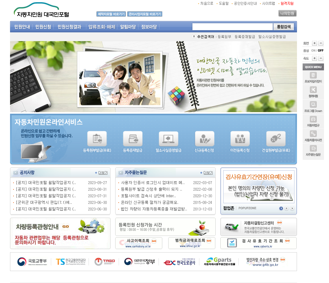 자동차민원 대국민포털 사이트에서 자동차등록증의 분실, 멸실, 훼손, 등록증의 기재란 부족 및 기타의 사유로 자동차등록증의 재발급을 신청할수있습니다.