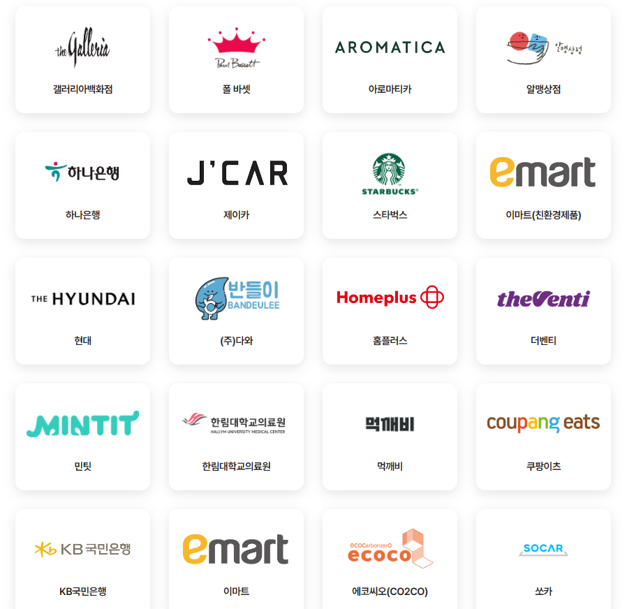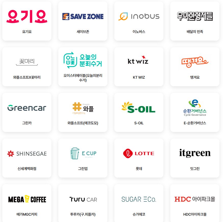 갤러리아백화점, 풀바셋, 아로마티카, 알맹상점, 하나은행, 제이카, 스타벅스, 이마트, 현대, (주)다와, 홈플러스, 더벤티, 민팃, 한림대학교의료원, 먹깨비, 쿠팡이츠, 국민은행, 에코씨오, 쏘카, 요기요, 세이브존, 이노버스, 배달의민족, 와플소프트X꽃마리, 오이스터에이블(오늘의 분리수거), KT WIZ, 땡겨요, 그린카, 와플소프트, 에스오일, E순환거버넌스, 신세계백화점, 그린업, 롯데, 잇그린, 메가MGC커피, 투루카, 슈가에코, HDC아이파크몰, 그린카드, ABC마트, GSTHE FRESH, 폴바셋, 배달특급, 자원순환보증금관리센터, 아모레퍼시픽, CU, KT, SK텔레콤, 위블비즈, 세븐일레븐, 해피해빗, 휴맥스 모빌리카, GS25